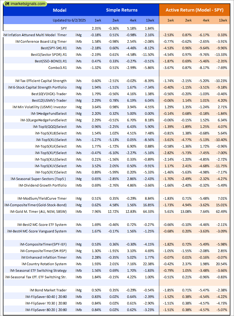 iM-Composite (SPY-IEF) Timer: The model’s out of sample performance YTD is -4.5%, and for the last 12 months is 3.6%. Over the same period the benchmark SPY performance was 1.4% and 13.8% respectively. Over the previous week the market value of the iM-Composite (SPY-IEF) Timer gained 0.53% at a time when SPY gained 2.35%. A starting capital of $100,000 at inception on 6/30/2016 would have grown to $205,557 which includes -$4,587 cash and excludes $7,366 spent on fees and slippage. |