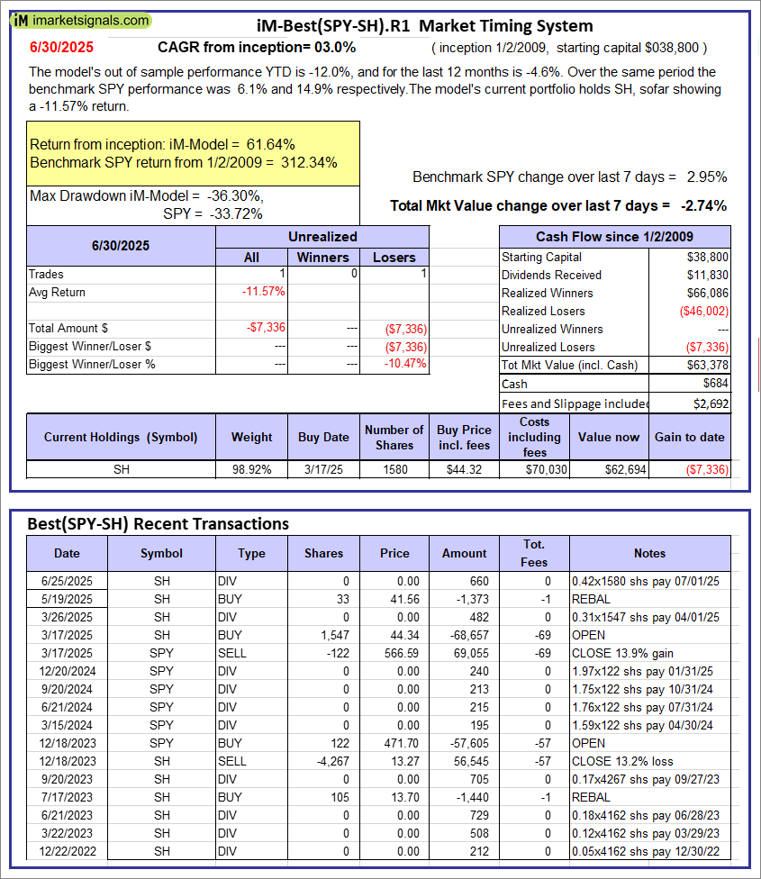 iM-Best(SPY-SH).R1: The model’s out of sample performance YTD is -12.0%, and for the last 12 months is -4.6%. Over the same period the benchmark SPY performance was 6.1% and 14.9% respectively. Over the previous week the market value of Best(SPY-SH) gained -2.74% at a time when SPY gained 2.95%. A starting capital of $100,000 at inception on 1/2/2009 would have grown to $63,378 which includes $684 cash and excludes $2,692 spent on fees and slippage. |