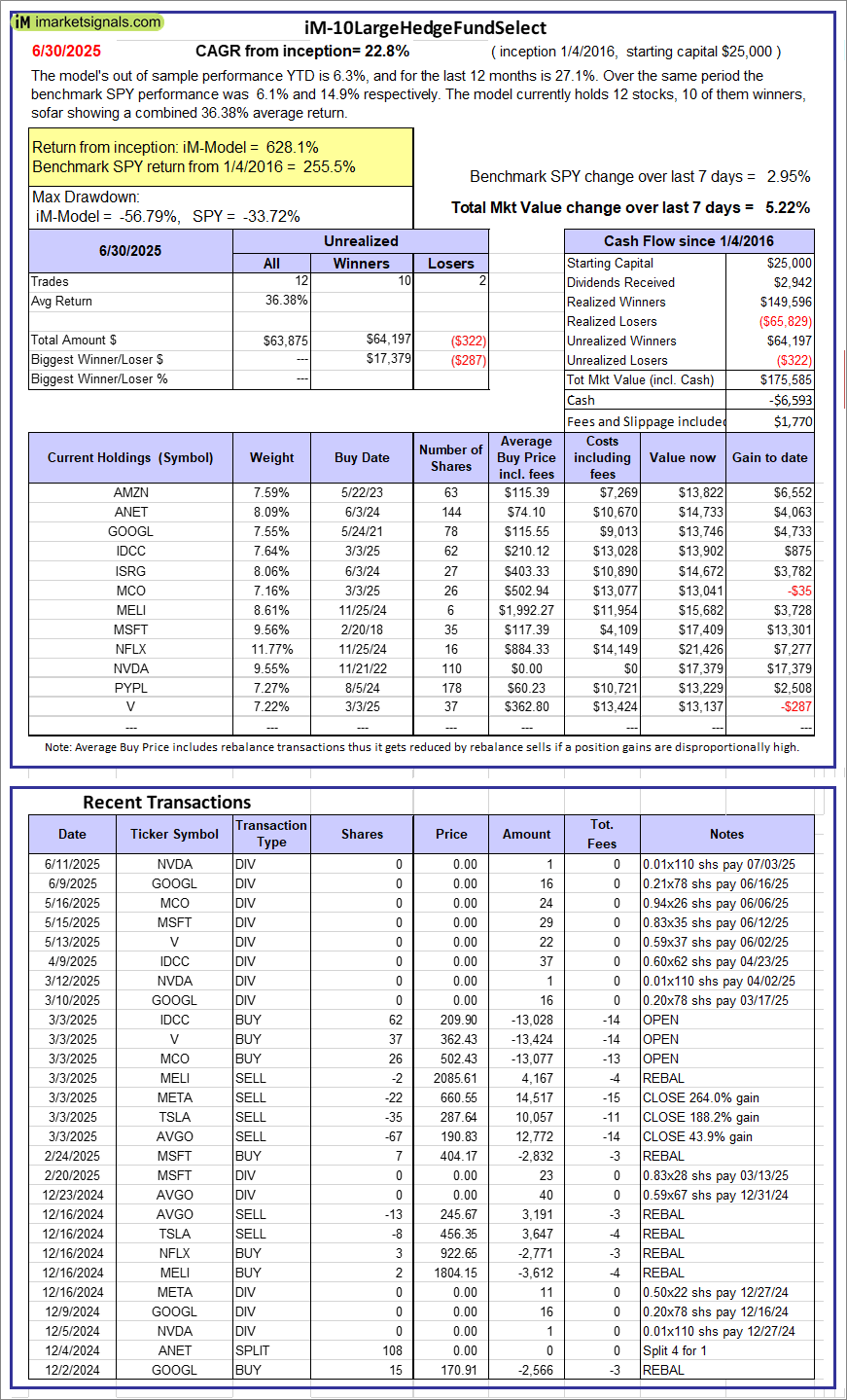 iM-10LargeHedgeFundSelect: Since inception, on 1/5/2016, the model gained 628.13% while the benchmark SPY gained 255.54% over the same period. Over the previous week the market value of iM-10LargeHedgeFundSelect gained 5.22% at a time when SPY gained 2.95%. A starting capital of $25,000 at inception on 1/5/2016 would have grown to $175,585 which includes -$6,593 cash and excludes $1,770 spent on fees and slippage. |
