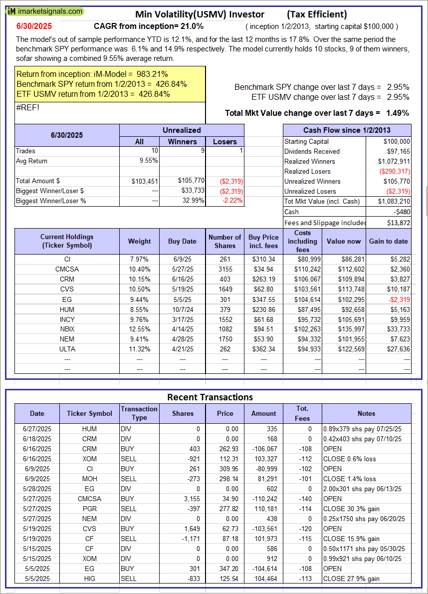 iM-Min Volatility(USMV) Investor (Tax Efficient): The model’s out of sample performance YTD is 12.1%, and for the last 12 months is 17.8%. Over the same period the benchmark SPY performance was 6.1% and 14.9% respectively. Since inception, on 1/3/2013, the model gained 983.21% while the benchmark SPY gained 426.84% and the ETF USMV gained 426.84% over the same period. Over the previous week the market value of iM-Best12(USMV)Q1 gained 1.49% at a time when SPY gained 2.95%. A starting capital of $100,000 at inception on 1/3/2013 would have grown to $1,083,210 which includes -$480 cash and excludes $13,872 spent on fees and slippage. |