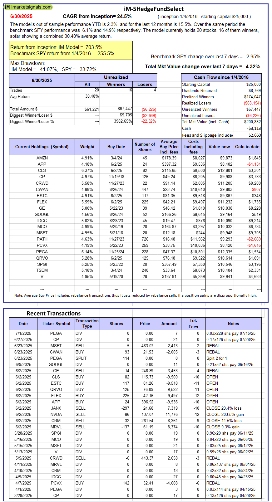 iM-5HedgeFundSelect: Since inception, on 1/5/2016, the model gained 703.53% while the benchmark SPY gained 255.54% over the same period. Over the previous week the market value of iM-5HedgeFundSelect gained 4.32% at a time when SPY gained 2.95%. A starting capital of $25,000 at inception on 1/5/2016 would have grown to $200,882 which includes -$3,113 cash and excludes $2,660 spent on fees and slippage. |