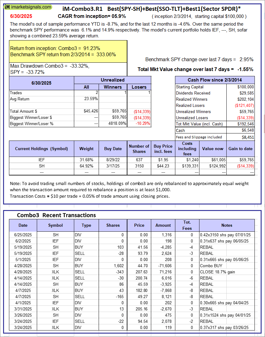 iM-Combo3.R1: The model’s out of sample performance YTD is -8.7%, and for the last 12 months is -4.6%. Over the same period the benchmark SPY performance was 6.1% and 14.9% respectively. Over the previous week the market value of iM-Combo3.R1 gained -1.55% at a time when SPY gained 2.95%. A starting capital of $100,000 at inception on 2/3/2014 would have grown to $192,546 which includes $6,548 cash and excludes $8,451 spent on fees and slippage. |