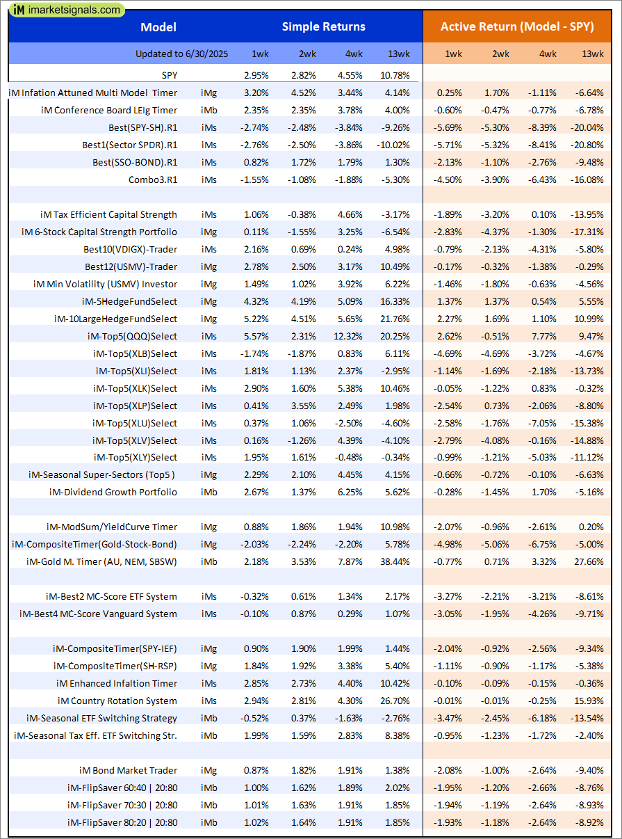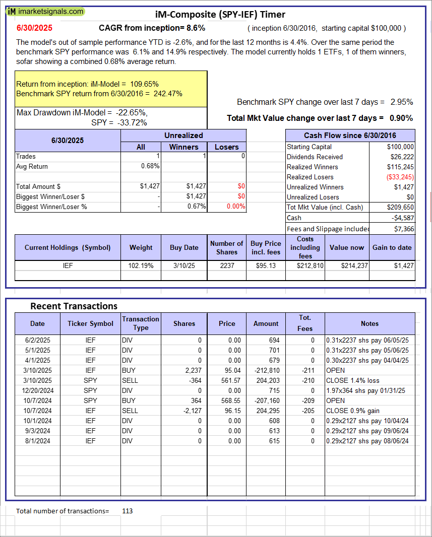 iM-Composite (SPY-IEF) Timer: The model’s out of sample performance YTD is -2.6%, and for the last 12 months is 4.4%. Over the same period the benchmark SPY performance was 6.1% and 14.9% respectively. Over the previous week the market value of the iM-Composite (SPY-IEF) Timer gained 0.90% at a time when SPY gained 2.95%. A starting capital of $100,000 at inception on 6/30/2016 would have grown to $209,650 which includes -$4,587 cash and excludes $7,366 spent on fees and slippage. |