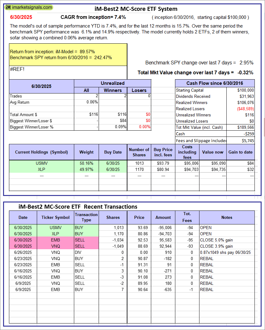 iM-Best2 MC-Score ETF System: The model’s out of sample performance YTD is 7.4%, and for the last 12 months is 15.7%. Over the same period the benchmark SPY performance was 6.1% and 14.9% respectively. Over the previous week the market value of the iM-Best2 MC-Score ETF System gained -0.32% at a time when SPY gained 2.95%. A starting capital of $100,000 at inception on 6/30/2016 would have grown to $189,566 which includes -$259 cash and excludes $5,745 spent on fees and slippage. |