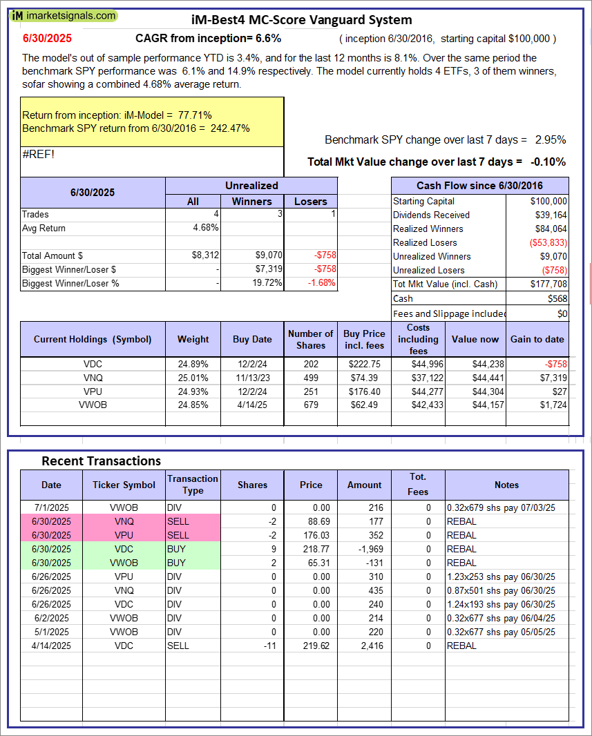iM-Best4 MC-Score Vanguard System: The model’s out of sample performance YTD is 3.4%, and for the last 12 months is 8.1%. Over the same period the benchmark SPY performance was 6.1% and 14.9% respectively. Over the previous week the market value of the iM-Best4 MC-Score Vanguard System gained -0.10% at a time when SPY gained 2.95%. A starting capital of $100,000 at inception on 6/30/2016 would have grown to $177,708 which includes $568 cash and excludes $00 spent on fees and slippage. |