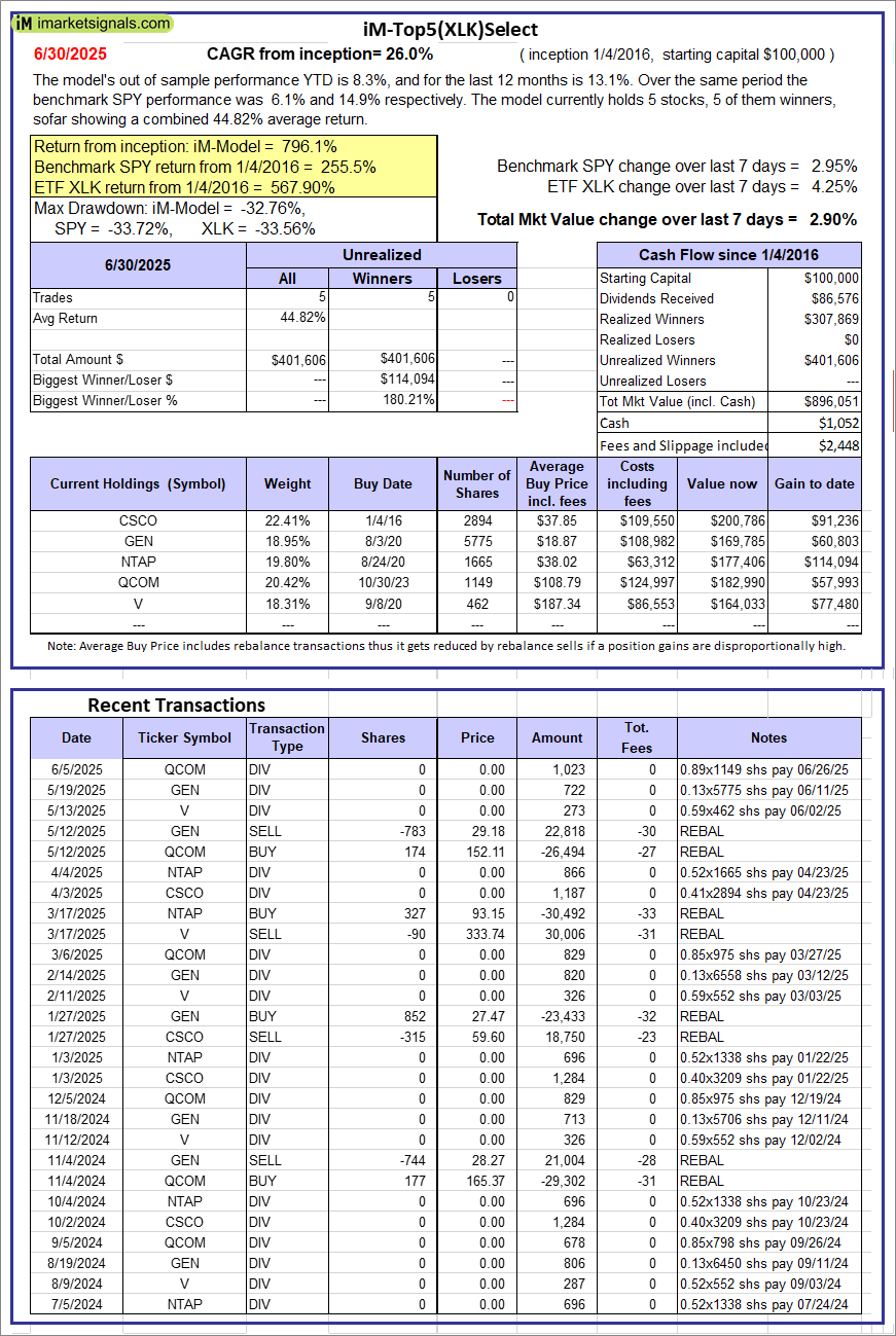 iM-Top5(XLK)Select: Since inception, on 1/5/2016, the model gained 796.05% while the benchmark SPY gained 255.54% over the same period. Over the previous week the market value of iM-Top5(XLK)Select gained 2.90% at a time when SPY gained 2.95%. A starting capital of $100,000 at inception on 1/5/2016 would have grown to $896,051 which includes $1,052 cash and excludes $2,448 spent on fees and slippage. |
