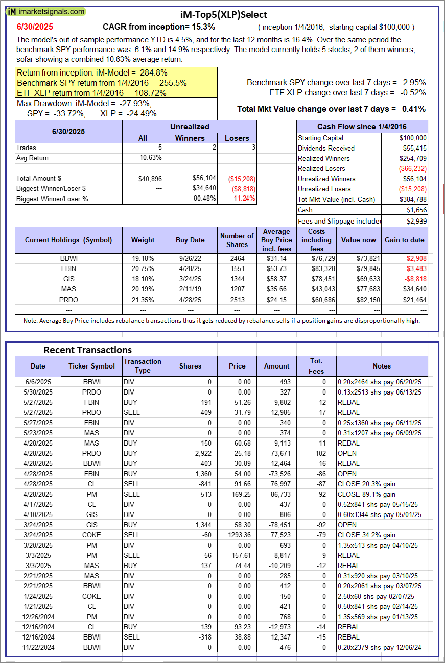 iM-Top5(XLP)Select: Since inception, on 1/5/2016, the model gained 284.79% while the benchmark SPY gained 255.54% over the same period. Over the previous week the market value of iM-Top5(XLP)Select gained 0.41% at a time when SPY gained 2.95%. A starting capital of $100,000 at inception on 1/5/2016 would have grown to $384,788 which includes $1,656 cash and excludes $2,939 spent on fees and slippage. |