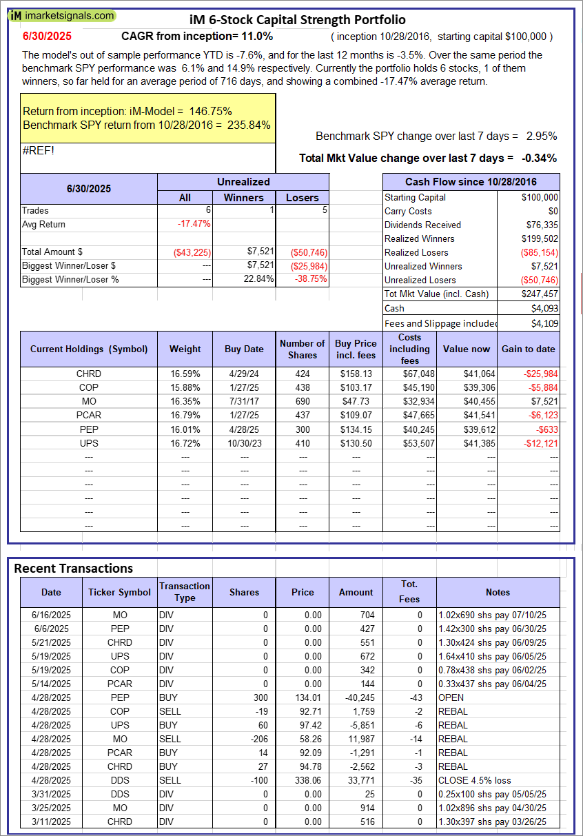 iM 6-Stock Capital Strength Portfolio: The model’s out of sample performance YTD is -7.6%, and for the last 12 months is -3.5%. Over the same period the benchmark SPY performance was 6.1% and 14.9% respectively. Over the previous week the market value of the iM 6-Stock Capital Strength Portfolio gained -0.34% at a time when SPY gained 2.95%. A starting capital of $100,000 at inception on 10/28/2016 would have grown to $247,457 which includes $4,093 cash and excludes $4,109 spent on fees and slippage. |