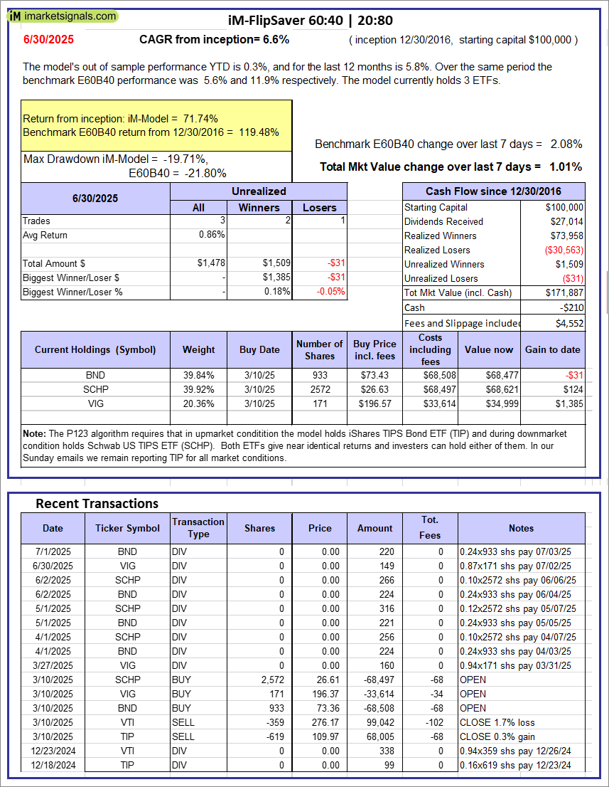 iM-FlipSaver 60:40 | 20:80 – 2017: The model’s out of sample performance YTD is 0.3%, and for the last 12 months is 5.8%. Over the same period the benchmark E60B40 performance was 5.6% and 11.9% respectively. Over the previous week the market value of iM-FlipSaver 80:20 | 20:80 gained 1.01% at a time when SPY gained 2.08%. A starting capital of $100,000 at inception on 7/16/2015 would have grown to $171,887 which includes -$210 cash and excludes $4,552 spent on fees and slippage. |