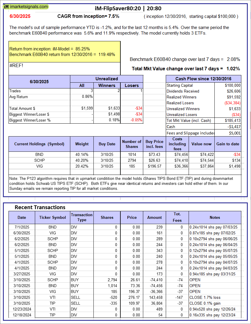 iM-FlipSaver 80:20 | 20:80 – 2017: The model’s out of sample performance YTD is -1.2%, and for the last 12 months is 5.4%. Over the same period the benchmark E60B40 performance was 5.6% and 11.9% respectively. Over the previous week the market value of iM-FlipSaver 80:20 | 20:80 gained 1.02% at a time when SPY gained 2.08%. A starting capital of $100,000 at inception on 1/2/2017 would have grown to $185,413 which includes -$1,417 cash and excludes $5,001 spent on fees and slippage. |