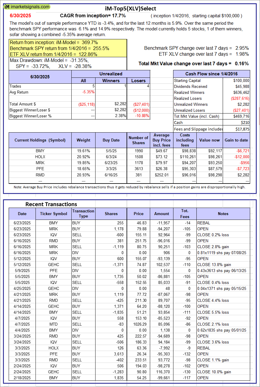 iM-Top5(XLV)Select: Since inception, on 1/5/2016, the model gained 369.72% while the benchmark SPY gained 255.54% over the same period. Over the previous week the market value of iM-Top5(XLV)Select gained 0.16% at a time when SPY gained 2.95%. A starting capital of $100,000 at inception on 1/5/2016 would have grown to $469,716 which includes $210 cash and excludes $17,875 spent on fees and slippage. |