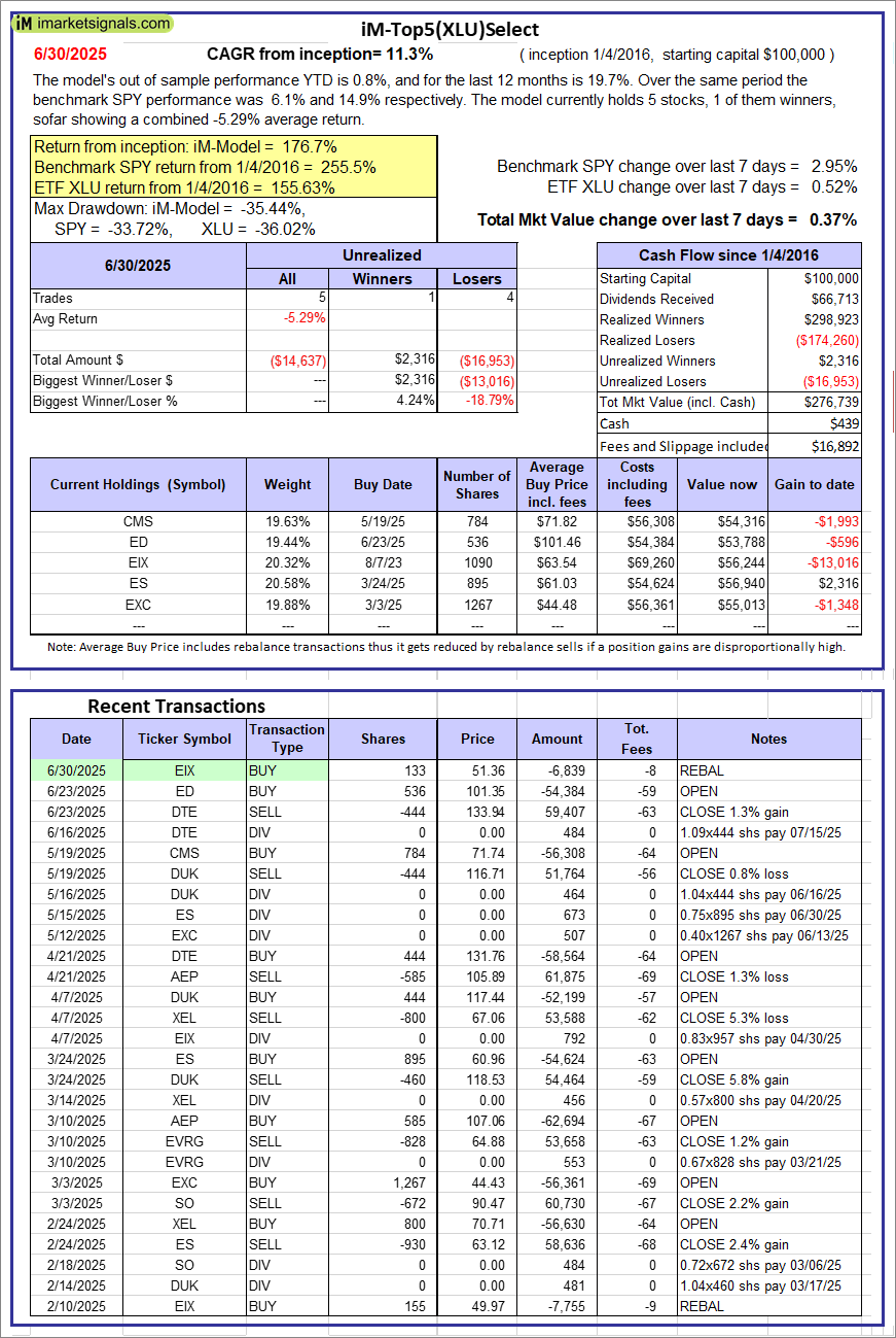 iM-Top5(XLU)Select: Since inception, on 1/5/2016, the model gained 176.74% while the benchmark SPY gained 255.54% over the same period. Over the previous week the market value of iM-Top5(XLU)Select gained 0.37% at a time when SPY gained 2.95%. A starting capital of $100,000 at inception on 1/5/2016 would have grown to $276,739 which includes $439 cash and excludes $16,892 spent on fees and slippage. |