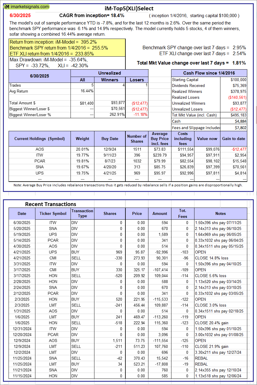iM-Top5(XLI)Select: Since inception, on 1/5/2016, the model gained 395.18% while the benchmark SPY gained 255.54% over the same period. Over the previous week the market value of iM-Top5(XLI)Select gained 1.81% at a time when SPY gained 2.95%. A starting capital of $100,000 at inception on 1/5/2016 would have grown to $495,183 which includes $4,884 cash and excludes $7,802 spent on fees and slippage. |