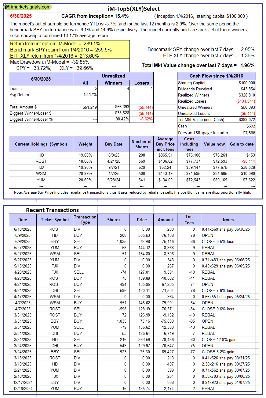 iM-Top5(XLY)Select: Since inception, on 1/5/2016, the model gained 289.07% while the benchmark SPY gained 255.54% over the same period. Over the previous week the market value of iM-Top5(XLY)Select gained 1.96% at a time when SPY gained 2.95%. A starting capital of $100,000 at inception on 1/5/2016 would have grown to $389,072 which includes $692 cash and excludes $7,566 spent on fees and slippage. |