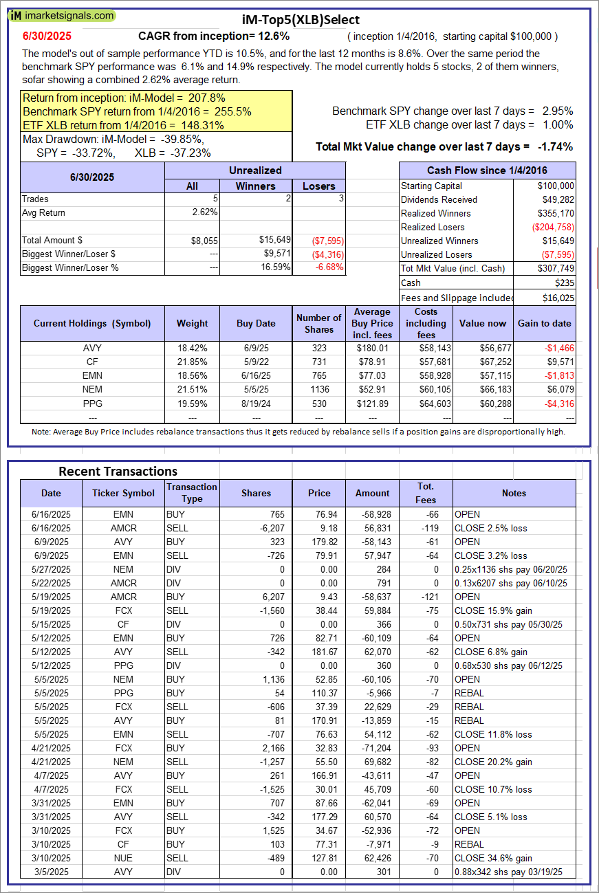 iM-Top5(XLB)Select: Since inception, on 1/5/2016, the model gained 207.75% while the benchmark SPY gained 255.54% over the same period. Over the previous week the market value of iM-Top5(XLB)Select gained -1.74% at a time when SPY gained 2.95%. A starting capital of $100,000 at inception on 1/5/2016 would have grown to $307,749 which includes $235 cash and excludes $16,025 spent on fees and slippage. |