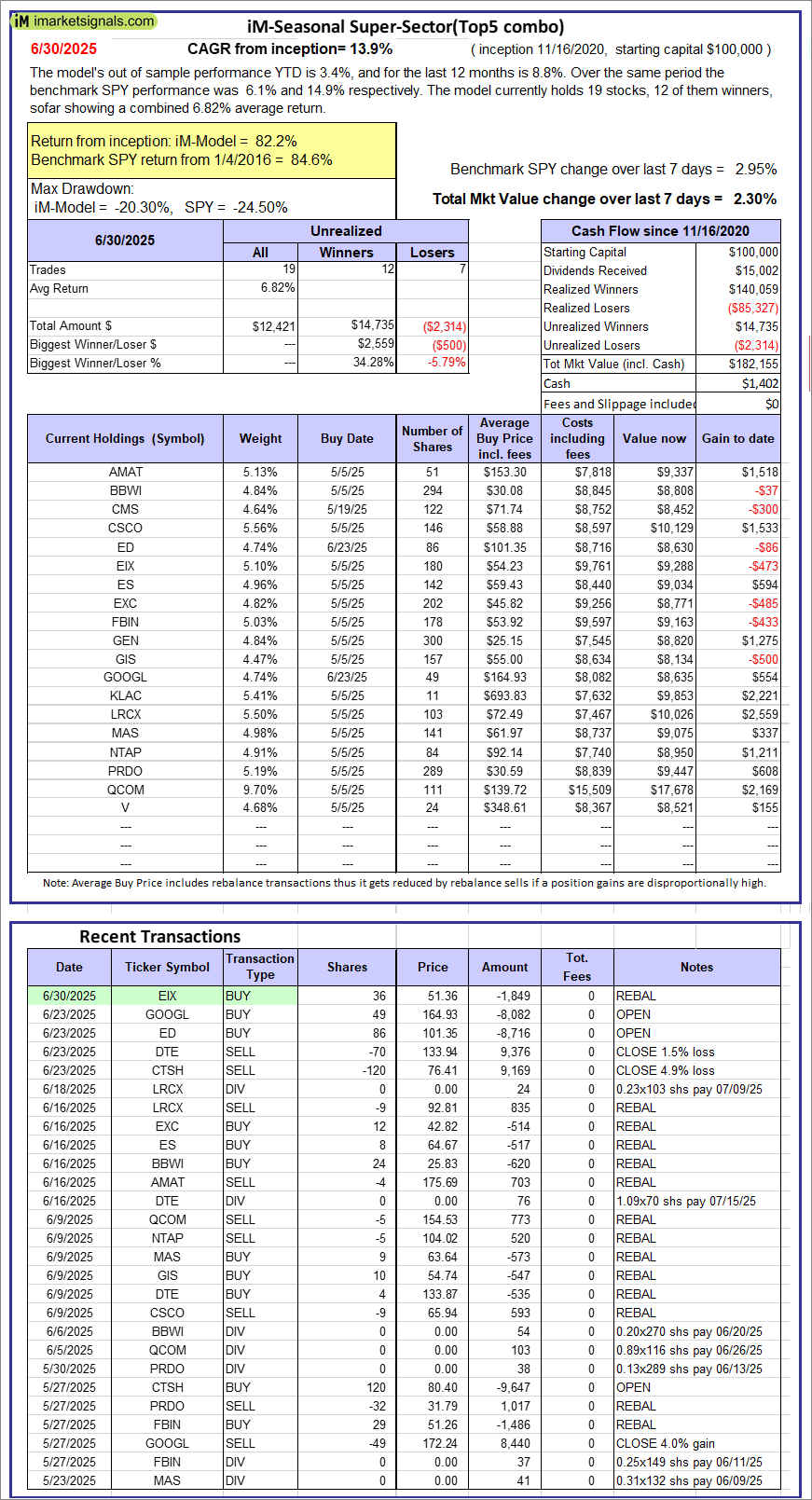 iM-Seasonal Super-Sectors (Top5 combo) : Since inception, on 11/17/2020, the model gained 82.15% while the benchmark SPY gained 84.56% over the same period. Over the previous week the market value of iM-Seasonal Super-Sectors (Top5 combo) gained 2.30% at a time when SPY gained 2.95%. A starting capital of $100,000 at inception on 11/17/2020 would have grown to $182,155 which includes $1,402 cash and excludes $00 spent on fees and slippage. |