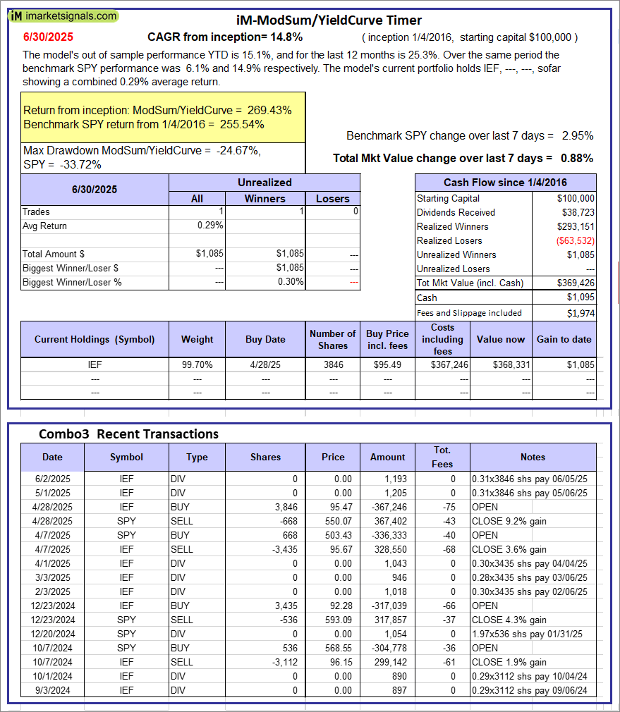 iM-ModSum/YieldCurve Timer: The model’s out of sample performance YTD is 15.1%, and for the last 12 months is 25.3%. Over the same period the benchmark SPY performance was 6.1% and 14.9% respectively. Over the previous week the market value of iM-PortSum/YieldCurve Timer gained 0.88% at a time when SPY gained 2.95%. A starting capital of $100,000 at inception on 1/1/2016 would have grown to $369,426 which includes $1,095 cash and excludes $1,974 spent on fees and slippage. |