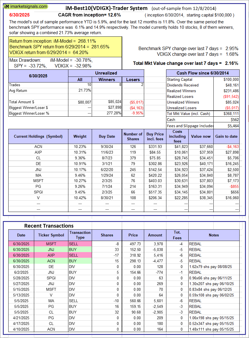 iM-Best10(VDIGX)-Trader: The model’s out of sample performance YTD is 5.9%, and for the last 12 months is 11.8%. Over the same period the benchmark SPY performance was 6.1% and 14.9% respectively. Since inception, on 7/1/2014, the model gained 268.11% while the benchmark SPY gained 281.65% and VDIGX gained 64.20% over the same period. Over the previous week the market value of iM-Best10(VDIGX) gained 2.16% at a time when SPY gained 2.95%. A starting capital of $100,000 at inception on 7/1/2014 would have grown to $368,111 which includes $562 cash and excludes $5,464 spent on fees and slippage. |
