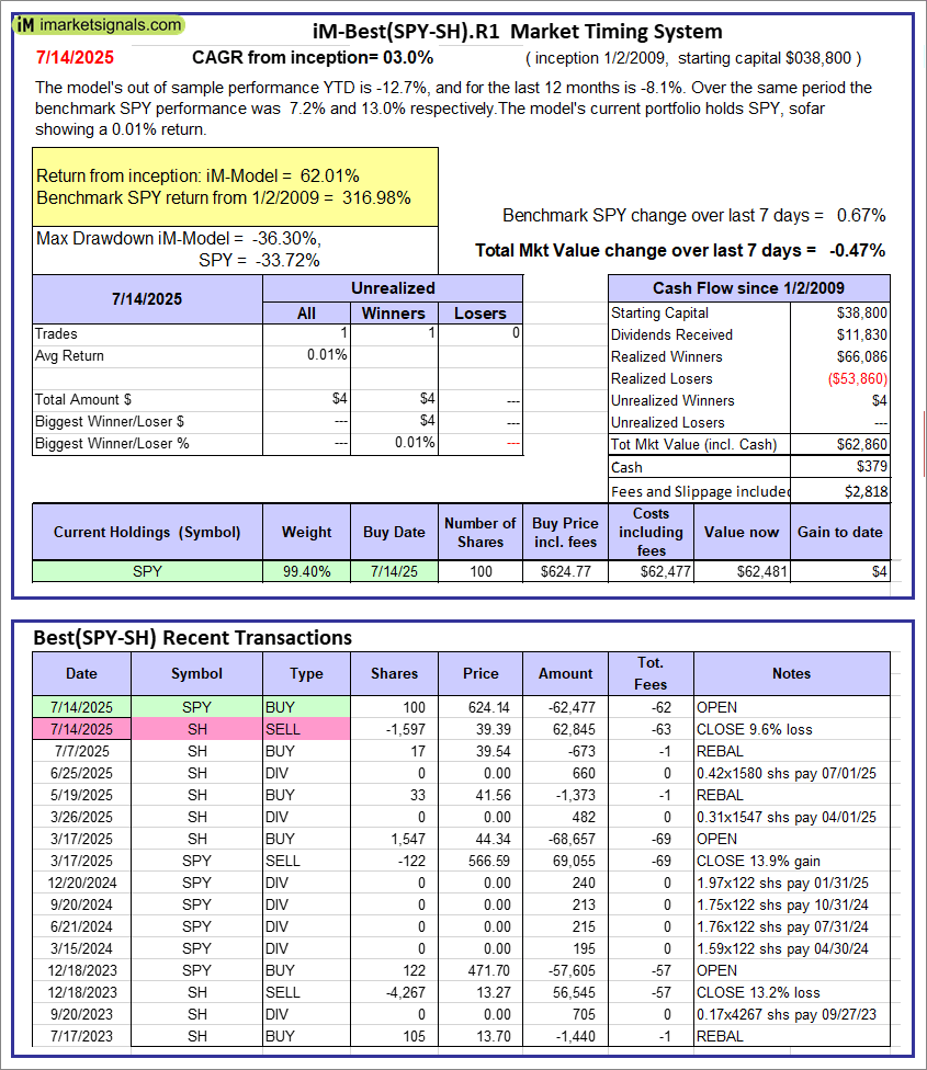 iM-Best(SPY-SH).R1: The model’s out of sample performance YTD is -12.7%, and for the last 12 months is -8.1%. Over the same period the benchmark SPY performance was 7.2% and 13.0% respectively. Over the previous week the market value of Best(SPY-SH) gained -0.47% at a time when SPY gained 0.67%. A starting capital of $100,000 at inception on 1/2/2009 would have grown to $62,860 which includes $379 cash and excludes $2,818 spent on fees and slippage. |