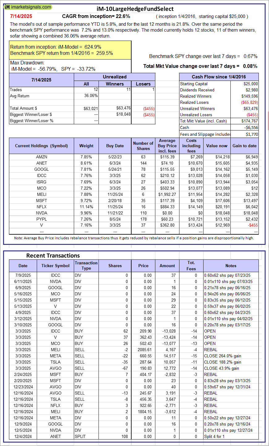 iM-10LargeHedgeFundSelect: Since inception, on 1/5/2016, the model gained 624.86% while the benchmark SPY gained 259.54% over the same period. Over the previous week the market value of iM-10LargeHedgeFundSelect gained 0.08% at a time when SPY gained 0.67%. A starting capital of $25,000 at inception on 1/5/2016 would have grown to $174,767 which includes -$6,556 cash and excludes $1,770 spent on fees and slippage. |
