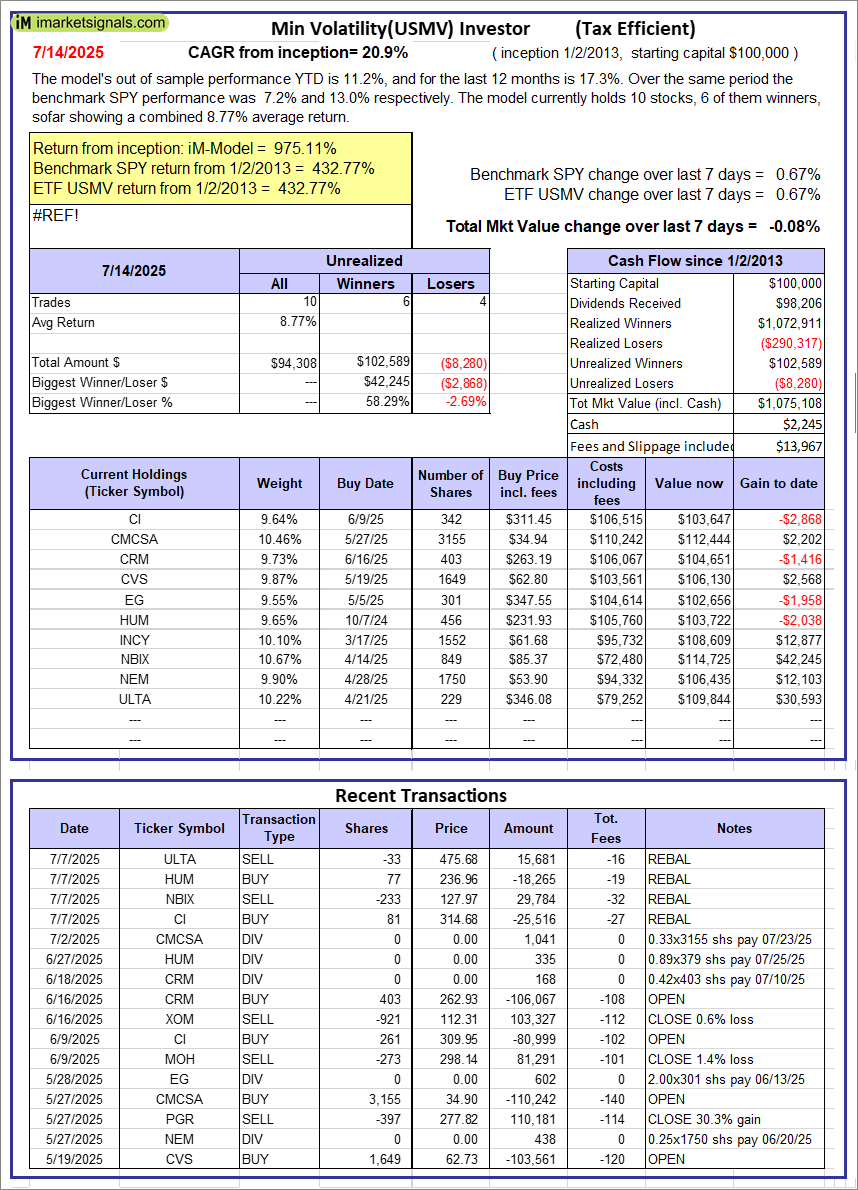 iM-Min Volatility(USMV) Investor (Tax Efficient): The model’s out of sample performance YTD is 11.2%, and for the last 12 months is 17.3%. Over the same period the benchmark SPY performance was 7.2% and 13.0% respectively. Since inception, on 1/3/2013, the model gained 975.11% while the benchmark SPY gained 432.77% and the ETF USMV gained 432.77% over the same period. Over the previous week the market value of iM-Best12(USMV)Q1 gained -0.08% at a time when SPY gained 0.67%. A starting capital of $100,000 at inception on 1/3/2013 would have grown to $1,075,108 which includes $2,245 cash and excludes $13,967 spent on fees and slippage. |