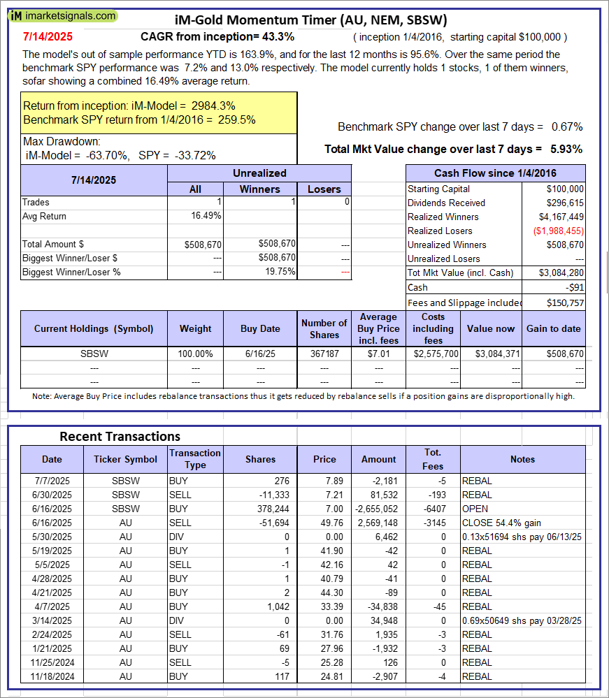 iM-Gold Momentum Timer (AU, NEM, SBSW): The model’s out of sample performance YTD is 163.9%, and for the last 12 months is 95.6%. Over the same period the benchmark SPY performance was 7.2% and 13.0% respectively. Over the previous week the market value of iM-Gold Momentum Timer (AU, NEM, SBSW) gained 5.93% at a time when SPY gained 0.67%. A starting capital of $100,000 at inception on 6/30/2016 would have grown to -$91 which includes $150,757 cash and excludes Gain to date spent on fees and slippage. |