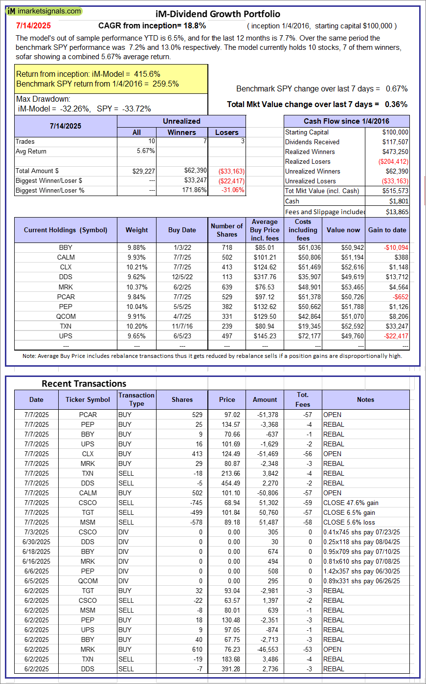 iM-Dividend Growth Portfolio: The model’s out of sample performance YTD is 6.5%, and for the last 12 months is 7.7%. Over the same period the benchmark SPY performance was 7.2% and 13.0% respectively. Over the previous week the market value of the iM-Dividend Growth Portfolio gained 0.36% at a time when SPY gained 0.67%. A starting capital of $100,000 at inception on 6/30/2016 would have grown to $515,573 which includes $1,801 cash and excludes $13,865 spent on fees and slippage. |