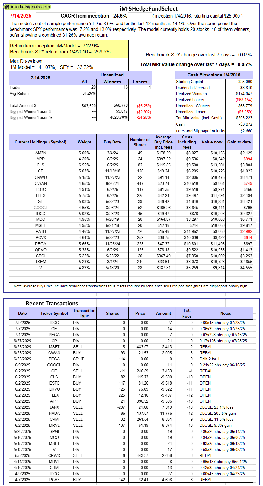 iM-5HedgeFundSelect: Since inception, on 1/5/2016, the model gained 712.89% while the benchmark SPY gained 259.54% over the same period. Over the previous week the market value of iM-5HedgeFundSelect gained 0.45% at a time when SPY gained 0.67%. A starting capital of $25,000 at inception on 1/5/2016 would have grown to $203,223 which includes -$3,072 cash and excludes $2,660 spent on fees and slippage. |