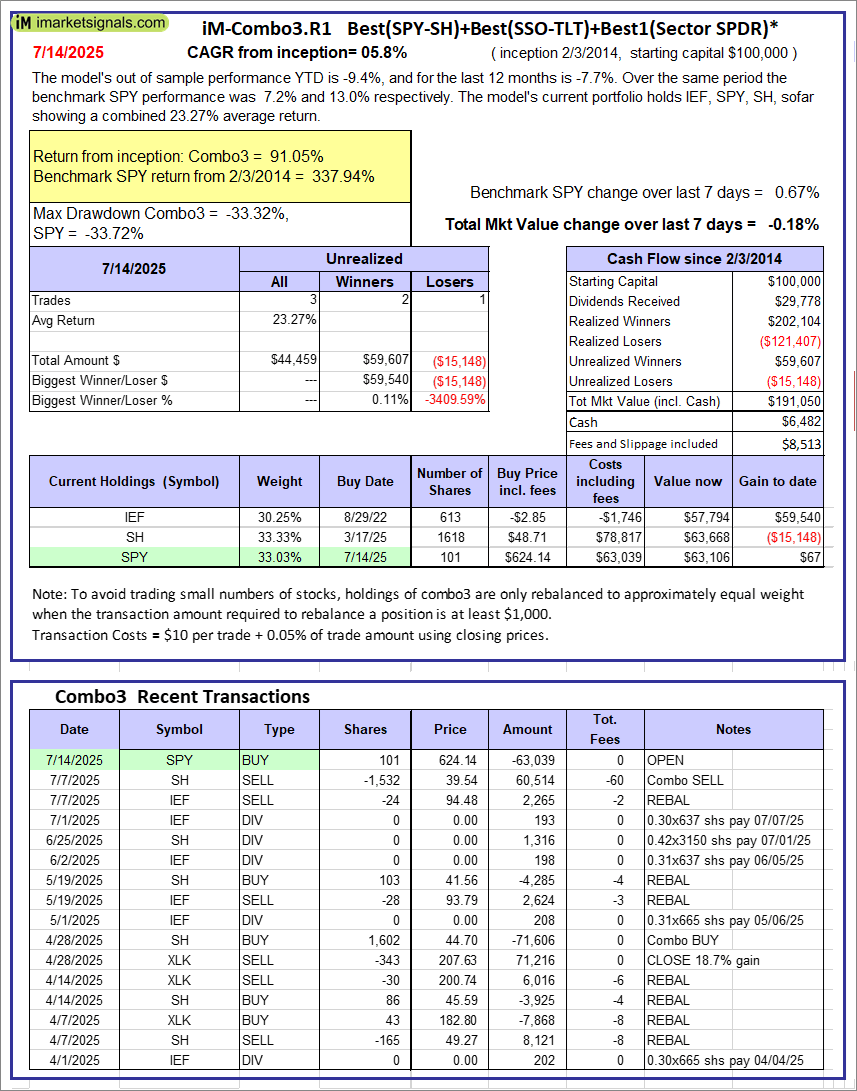 iM-Composite (SPY-IEF) Timer: The model’s out of sample performance YTD is -3.2%, and for the last 12 months is 2.0%. Over the same period the benchmark SPY performance was 7.2% and 13.0% respectively. Over the previous week the market value of the iM-Composite (SPY-IEF) Timer gained 0.66% at a time when SPY gained 0.67%. A starting capital of $100,000 at inception on 6/30/2016 would have grown to $208,350 which includes $913 cash and excludes $7,786 spent on fees and slippage. |
