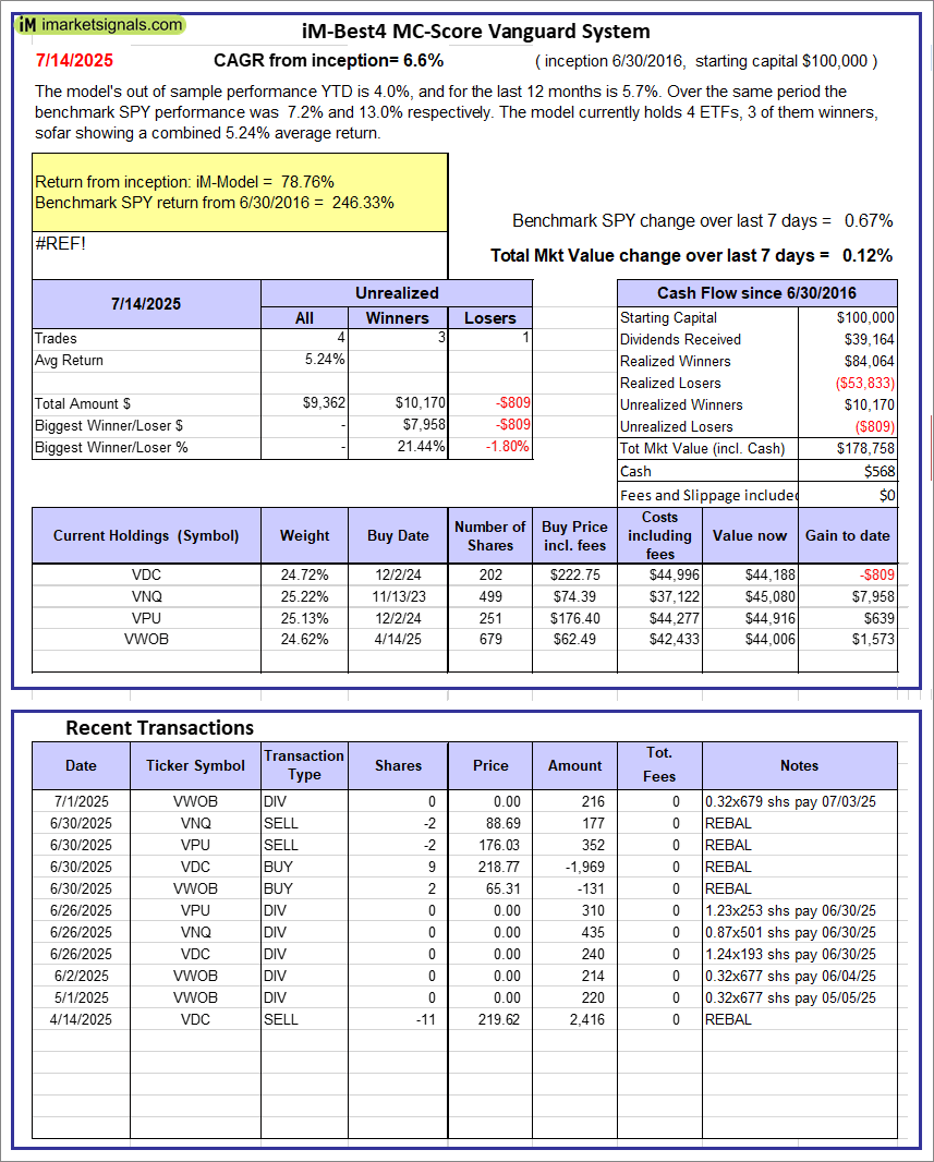 iM-Best4 MC-Score Vanguard System: The model’s out of sample performance YTD is 4.0%, and for the last 12 months is 5.7%. Over the same period the benchmark SPY performance was 7.2% and 13.0% respectively. Over the previous week the market value of the iM-Best4 MC-Score Vanguard System gained 0.12% at a time when SPY gained 0.67%. A starting capital of $100,000 at inception on 6/30/2016 would have grown to $178,758 which includes $568 cash and excludes $00 spent on fees and slippage. |