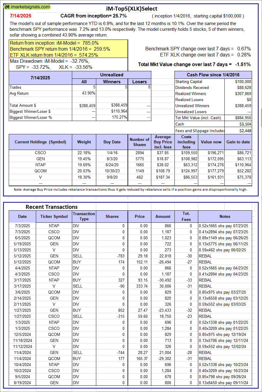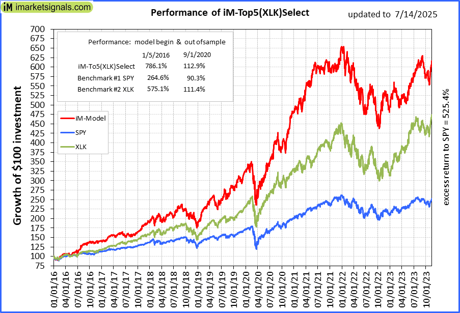 iM-Top5(XLK)Select: Since inception, on 1/5/2016, the model gained 784.96% while the benchmark SPY gained 259.54% over the same period. Over the previous week the market value of iM-Top5(XLK)Select gained -1.51% at a time when SPY gained 0.67%. A starting capital of $100,000 at inception on 1/5/2016 would have grown to $884,956 which includes $3,104 cash and excludes $2,448 spent on fees and slippage. |