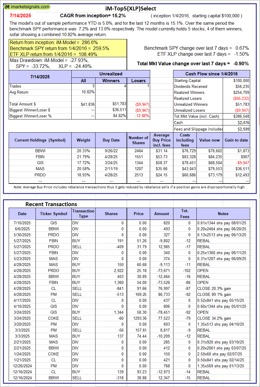 iM-Top5(XLP)Select: Since inception, on 1/5/2016, the model gained 286.55% while the benchmark SPY gained 259.54% over the same period. Over the previous week the market value of iM-Top5(XLP)Select gained -0.90% at a time when SPY gained 0.67%. A starting capital of $100,000 at inception on 1/5/2016 would have grown to $386,548 which includes $2,476 cash and excludes $2,939 spent on fees and slippage. |