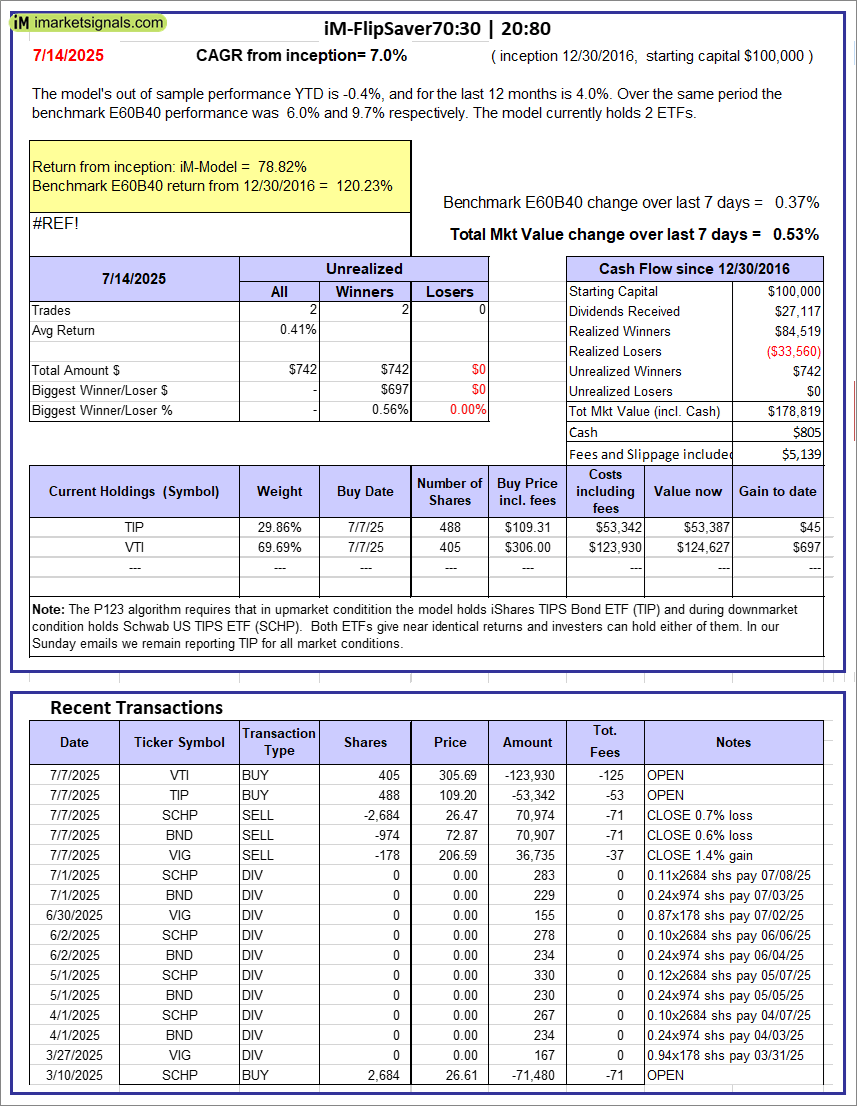 iM-FlipSaver 70:30 | 20:80 – 2017: The model’s out of sample performance YTD is -0.4%, and for the last 12 months is 4.0%. Over the same period the benchmark E60B40 performance was 6.0% and 9.7% respectively. Over the previous week the market value of iM-FlipSaver 70:30 | 20:80 gained 0.53% at a time when SPY gained 0.37%. A starting capital of $100,000 at inception on 7/15/2015 would have grown to $178,819 which includes $805 cash and excludes $5,139 spent on fees and slippage. |