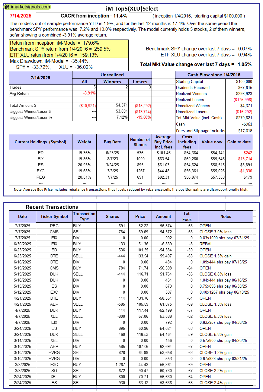 iM-Top5(XLU)Select: Since inception, on 1/5/2016, the model gained 179.62% while the benchmark SPY gained 259.54% over the same period. Over the previous week the market value of iM-Top5(XLU)Select gained 1.05% at a time when SPY gained 0.67%. A starting capital of $100,000 at inception on 1/5/2016 would have grown to $279,621 which includes -$961 cash and excludes $17,018 spent on fees and slippage. |
