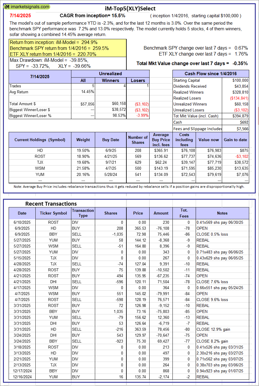 iM-Top5(XLY)Select: Since inception, on 1/5/2016, the model gained 294.88% while the benchmark SPY gained 259.54% over the same period. Over the previous week the market value of iM-Top5(XLY)Select gained -0.35% at a time when SPY gained 0.67%. A starting capital of $100,000 at inception on 1/5/2016 would have grown to $394,879 which includes $692 cash and excludes $7,566 spent on fees and slippage. |