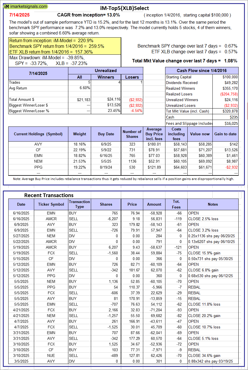 iM-Top5(XLB)Select: Since inception, on 1/5/2016, the model gained 220.88% while the benchmark SPY gained 259.54% over the same period. Over the previous week the market value of iM-Top5(XLB)Select gained 1.08% at a time when SPY gained 0.67%. A starting capital of $100,000 at inception on 1/5/2016 would have grown to $320,878 which includes $235 cash and excludes $16,025 spent on fees and slippage. |