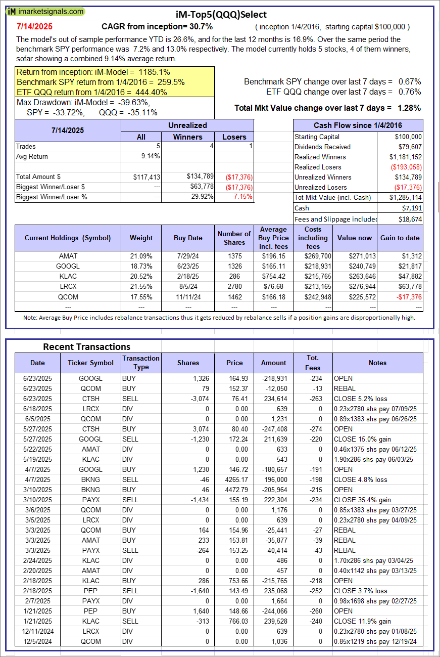 iM-Top5(QQQ)Select: Since inception, on 1/5/2016, the model gained 1185.11% while the benchmark SPY gained 259.54% over the same period. Over the previous week the market value of iM-Top5(QQQ)Select gained 1.28% at a time when SPY gained 0.67%. A starting capital of $100,000 at inception on 1/5/2016 would have grown to $1,285,114 which includes $7,191 cash and excludes $18,674 spent on fees and slippage. |