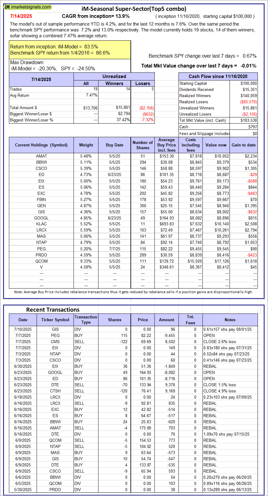 iM-Seasonal Super-Sectors (Top5 combo) : Since inception, on 11/17/2020, the model gained 83.54% while the benchmark SPY gained 86.64% over the same period. Over the previous week the market value of iM-Seasonal Super-Sectors (Top5 combo) gained -0.01% at a time when SPY gained 0.67%. A starting capital of $100,000 at inception on 11/17/2020 would have grown to $183,538 which includes $797 cash and excludes $00 spent on fees and slippage. |