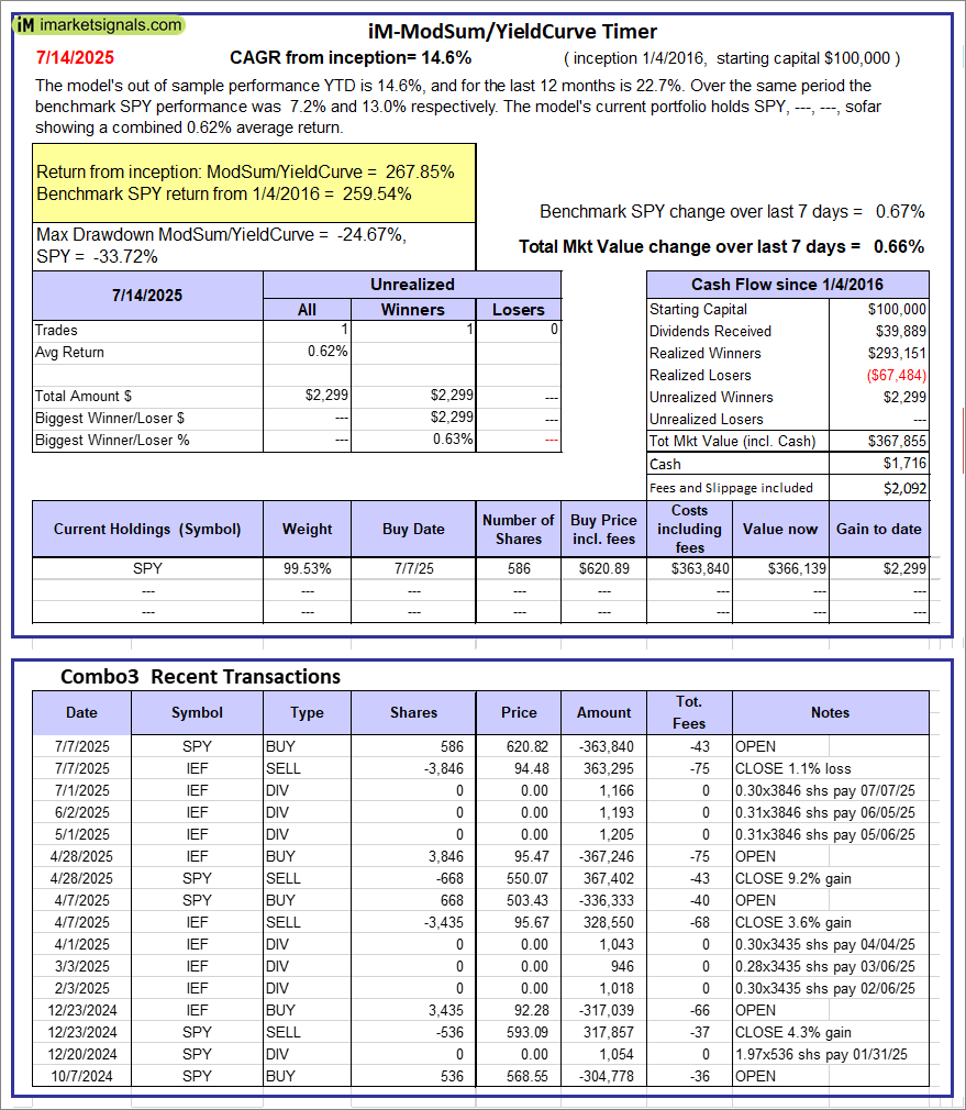 iM-ModSum/YieldCurve Timer: The model’s out of sample performance YTD is 14.6%, and for the last 12 months is 22.7%. Over the same period the benchmark SPY performance was 7.2% and 13.0% respectively. Over the previous week the market value of iM-PortSum/YieldCurve Timer gained 0.66% at a time when SPY gained 0.67%. A starting capital of $100,000 at inception on 1/1/2016 would have grown to $367,855 which includes $1,716 cash and excludes $2,092 spent on fees and slippage. |