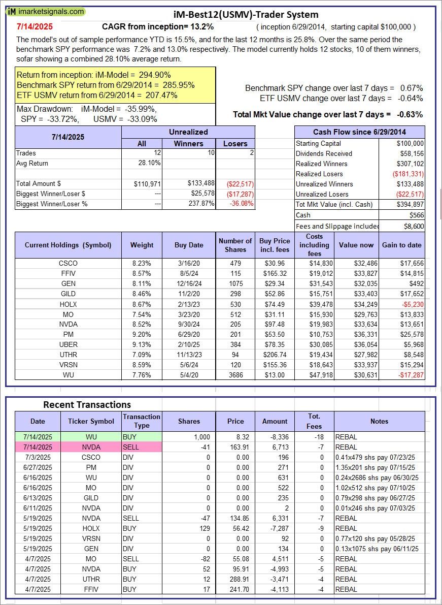 iM-Best12(USMV)-Trader: The model’s out of sample performance YTD is 15.5%, and for the last 12 months is 25.8%. Over the same period the benchmark SPY performance was 7.2% and 13.0% respectively. Since inception, on 6/30/2014, the model gained 294.90% while the benchmark SPY gained 285.95% and the ETF USMV gained 207.47% over the same period. Over the previous week the market value of iM-Best12(USMV)-Trader gained -0.63% at a time when SPY gained 0.67%. A starting capital of $100,000 at inception on 6/30/2014 would have grown to $394,897 which includes $566 cash and excludes $8,600 spent on fees and slippage. |