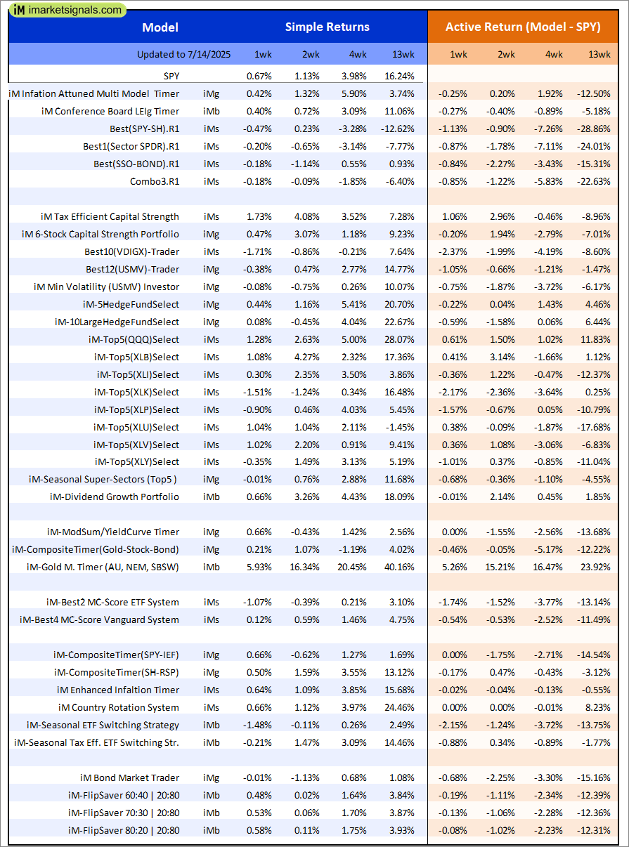 iM-Inflation Attuned Multi-Model Market Timer: The model’s out of sample performance YTD is 13.9%, and for the last 12 months is 13.2%. Over the same period the benchmark SPY performance was 7.2% and 13.0% respectively. Over the previous week the market value of the iM-Inflation Attuned Multi-Model Market Timer gained 0.42% at a time when SPY gained 0.67%. A starting capital of $100,000 at inception on 3/24/2017 would have grown to $140,828,695 which includes -$476,231 cash and excludes $3,953,990 spent on fees and slippage. |