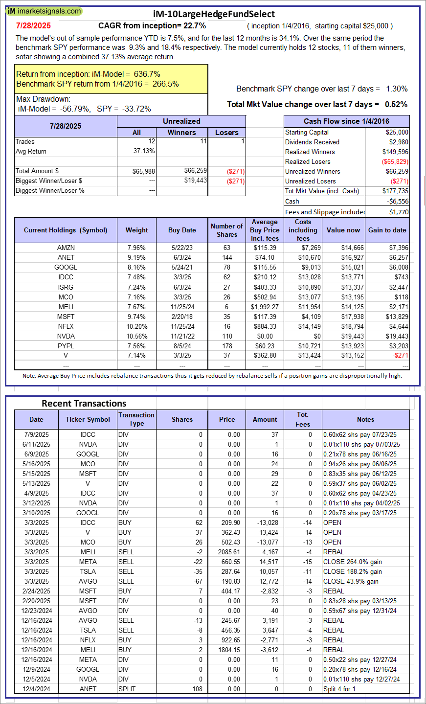 iM-10LargeHedgeFundSelect: Since inception, on 1/5/2016, the model gained 636.73% while the benchmark SPY gained 266.52% over the same period. Over the previous week the market value of iM-10LargeHedgeFundSelect gained 0.52% at a time when SPY gained 1.30%. A starting capital of $25,000 at inception on 1/5/2016 would have grown to $177,735 which includes -$6,556 cash and excludes $1,770 spent on fees and slippage. |