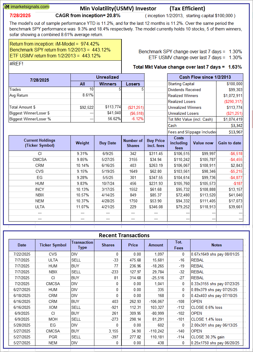 iM-Min Volatility(USMV) Investor (Tax Efficient): The model’s out of sample performance YTD is 11.2%, and for the last 12 months is 11.2%. Over the same period the benchmark SPY performance was 9.3% and 18.4% respectively. Since inception, on 1/3/2013, the model gained 974.42% while the benchmark SPY gained 443.12% and the ETF USMV gained 443.12% over the same period. Over the previous week the market value of iM-Best12(USMV)Q1 gained 1.63% at a time when SPY gained 1.30%. A starting capital of $100,000 at inception on 1/3/2013 would have grown to $1,074,419 which includes $3,342 cash and excludes $13,967 spent on fees and slippage. |