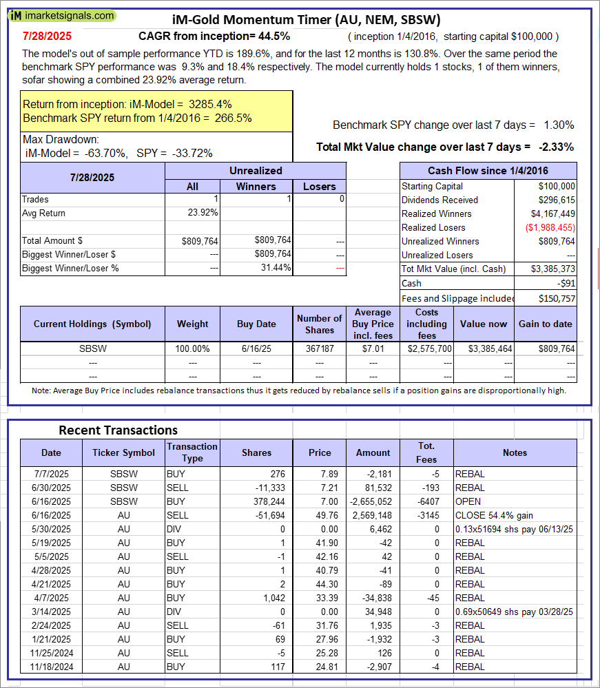 iM-Gold Momentum Timer (AU, NEM, SBSW): The model’s out of sample performance YTD is 189.6%, and for the last 12 months is 130.8%. Over the same period the benchmark SPY performance was 9.3% and 18.4% respectively. Over the previous week the market value of iM-Gold Momentum Timer (AU, NEM, SBSW) gained -2.33% at a time when SPY gained 1.30%. A starting capital of $100,000 at inception on 6/30/2016 would have grown to -$91 which includes $150,757 cash and excludes Gain to date spent on fees and slippage. |
