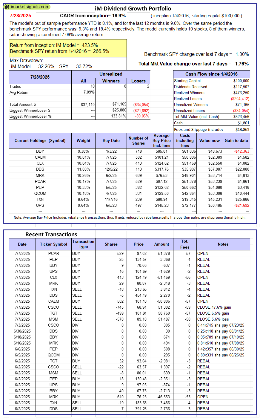 iM-Dividend Growth Portfolio: The model’s out of sample performance YTD is 8.1%, and for the last 12 months is 9.0%. Over the same period the benchmark SPY performance was 9.3% and 18.4% respectively. Over the previous week the market value of the iM-Dividend Growth Portfolio gained 1.76% at a time when SPY gained 1.30%. A starting capital of $100,000 at inception on 6/30/2016 would have grown to $523,456 which includes $1,801 cash and excludes $13,865 spent on fees and slippage. |