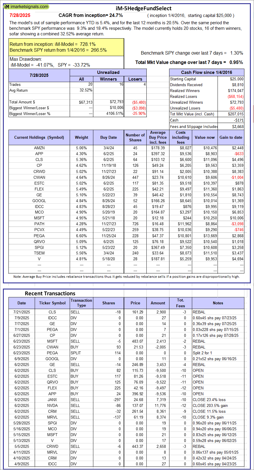 iM-5HedgeFundSelect: Since inception, on 1/5/2016, the model gained 728.06% while the benchmark SPY gained 266.52% over the same period. Over the previous week the market value of iM-5HedgeFundSelect gained 0.95% at a time when SPY gained 1.30%. A starting capital of $25,000 at inception on 1/5/2016 would have grown to $207,015 which includes -$171 cash and excludes $2,663 spent on fees and slippage. |