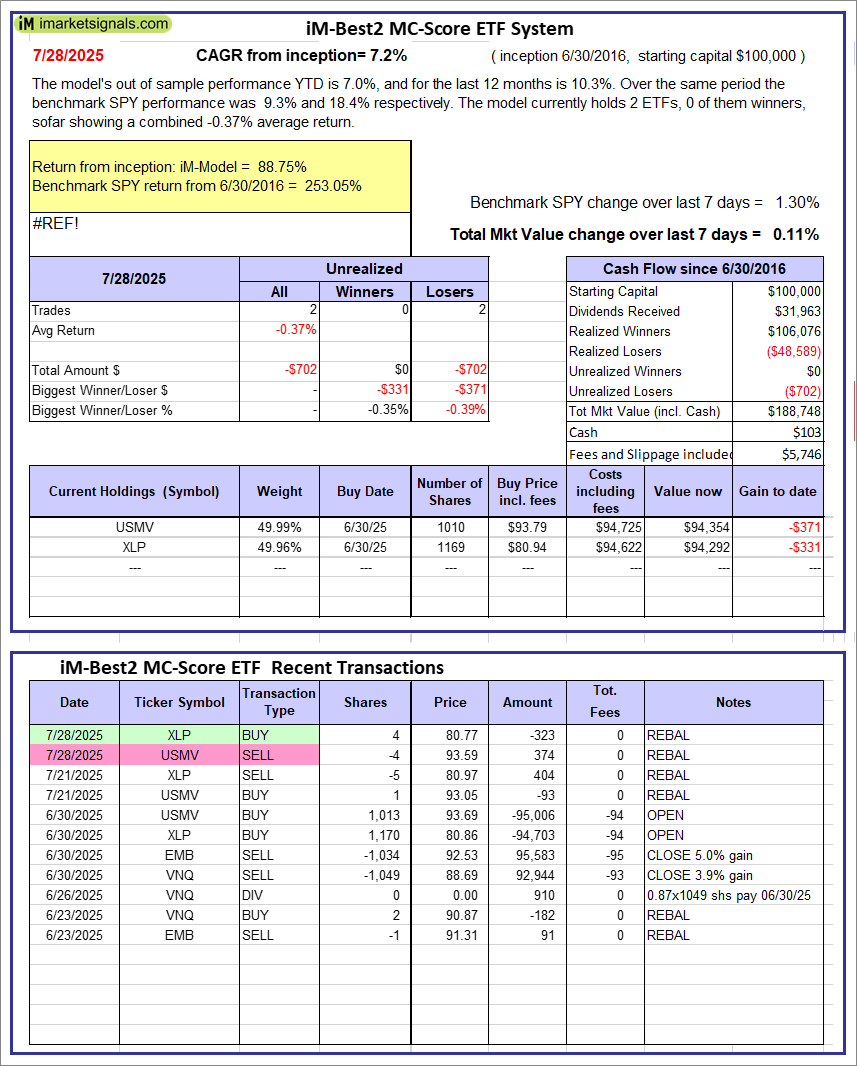 iM-Best2 MC-Score ETF System: The model’s out of sample performance YTD is 7.0%, and for the last 12 months is 10.3%. Over the same period the benchmark SPY performance was 9.3% and 18.4% respectively. Over the previous week the market value of the iM-Best2 MC-Score ETF System gained 0.11% at a time when SPY gained 1.30%. A starting capital of $100,000 at inception on 6/30/2016 would have grown to $188,748 which includes $103 cash and excludes $5,746 spent on fees and slippage. |