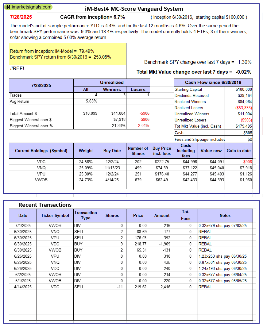 iM-Best4 MC-Score Vanguard System: The model’s out of sample performance YTD is 4.4%, and for the last 12 months is 4.6%. Over the same period the benchmark SPY performance was 9.3% and 18.4% respectively. Over the previous week the market value of the iM-Best4 MC-Score Vanguard System gained -0.02% at a time when SPY gained 1.30%. A starting capital of $100,000 at inception on 6/30/2016 would have grown to $179,495 which includes $568 cash and excludes $00 spent on fees and slippage. |
