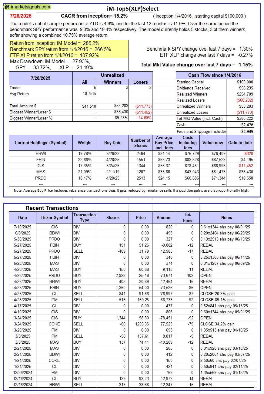 iM-Top5(XLP)Select: Since inception, on 1/5/2016, the model gained 286.22% while the benchmark SPY gained 266.52% over the same period. Over the previous week the market value of iM-Top5(XLP)Select gained 1.15% at a time when SPY gained 1.30%. A starting capital of $100,000 at inception on 1/5/2016 would have grown to $386,222 which includes $2,476 cash and excludes $2,939 spent on fees and slippage. |