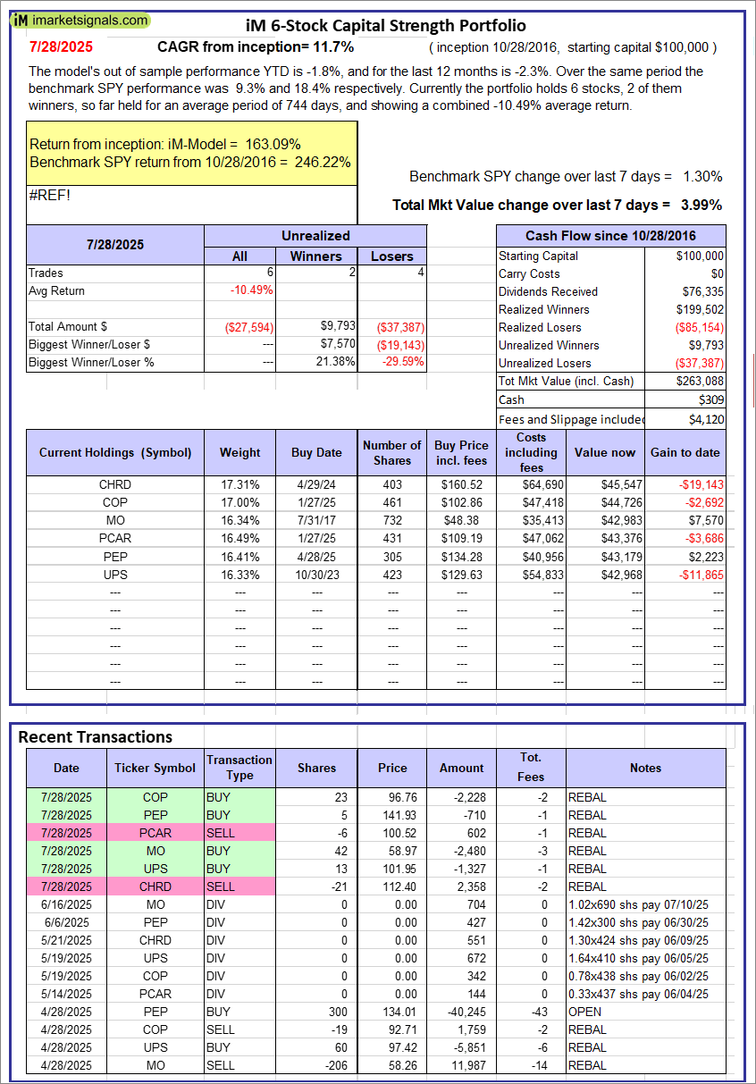 iM 6-Stock Capital Strength Portfolio: The model’s out of sample performance YTD is -1.8%, and for the last 12 months is -2.3%. Over the same period the benchmark SPY performance was 9.3% and 18.4% respectively. Over the previous week the market value of the iM 6-Stock Capital Strength Portfolio gained 3.99% at a time when SPY gained 1.30%. A starting capital of $100,000 at inception on 10/28/2016 would have grown to $263,088 which includes $309 cash and excludes $4,120 spent on fees and slippage. |